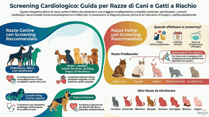 Con questa consapevolezza, NarcosVet ha deciso di mettere a disposizione di veterinari e proprietari una serie di poster informativi dedicati allo screening cardiologico. L’obiettivo è semplice: offrire un supporto immediato, pratico e basato sulle migliori conoscenze disponibili, per capire quali esami effettuare, in quali razze o situazioni e con quale frequenza.